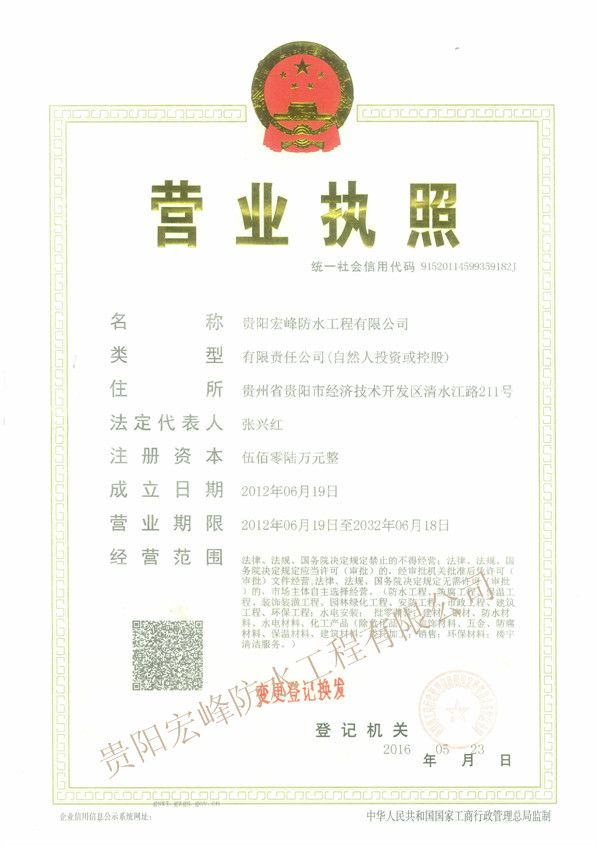 宏峰公司属国家防水防腐保温工程专业承包贰级资质企业,经贵州省住房和城乡建设厅考核合格